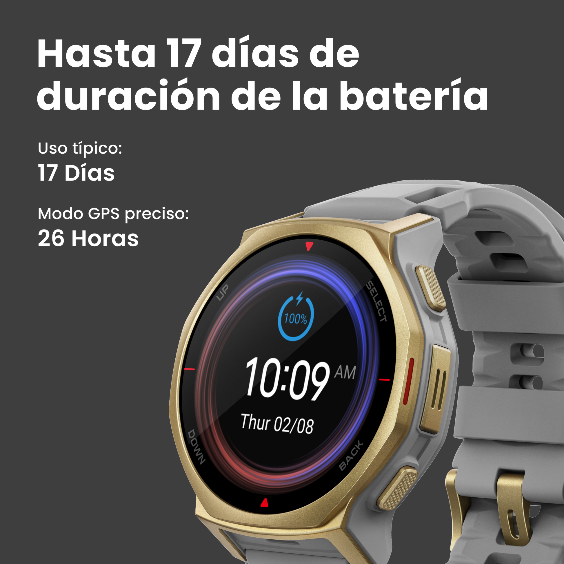 Diseñado para acompañarte en tus aventuras más largas, este reloj ofrece una duración de batería excepcional ⁸ para que puedas concentrarte en el viaje, no en el cargador. Ya sea que te enfrentes a excursiones de varios días, semanas de competición o misiones remotas, se mantiene cargado cuando más lo necesitas.