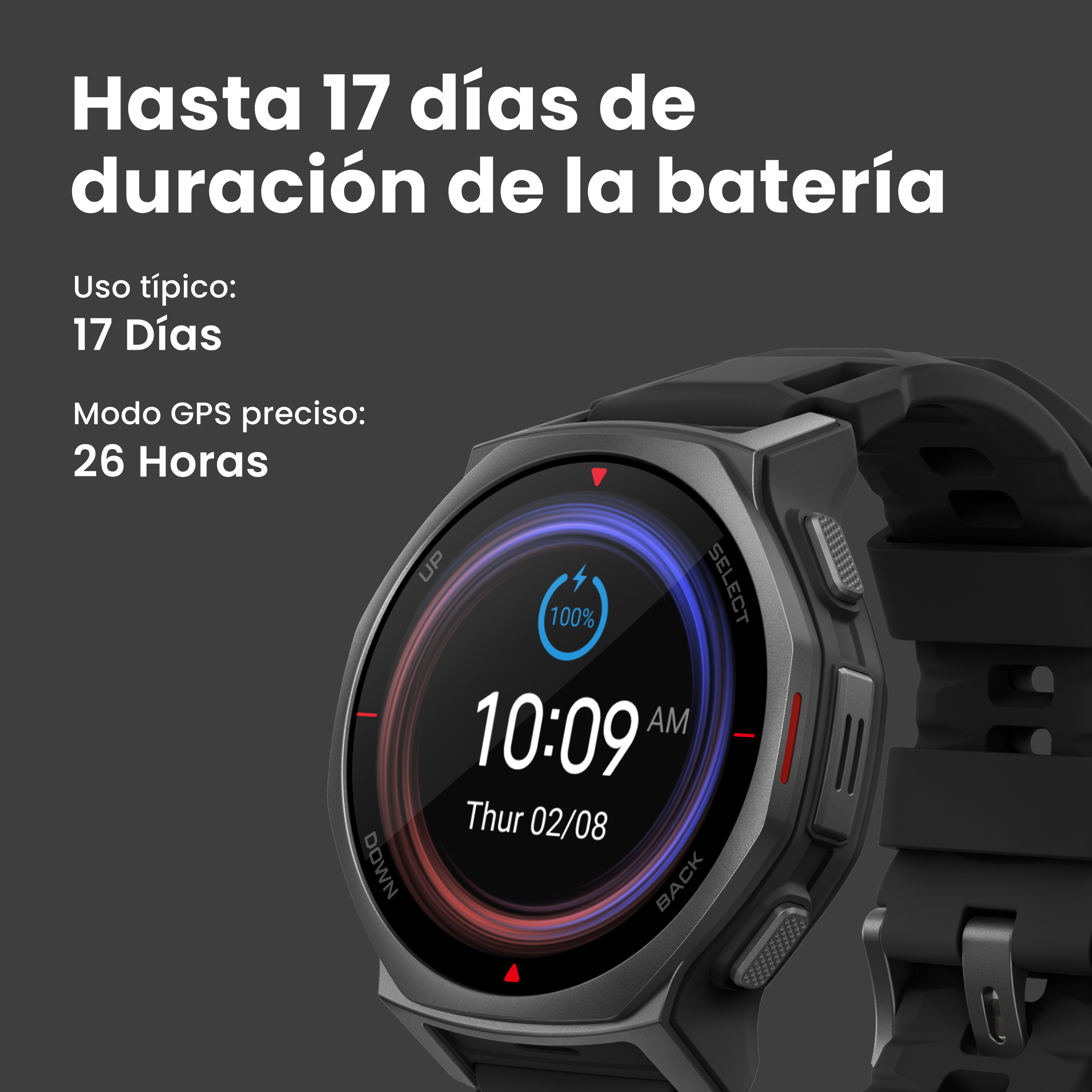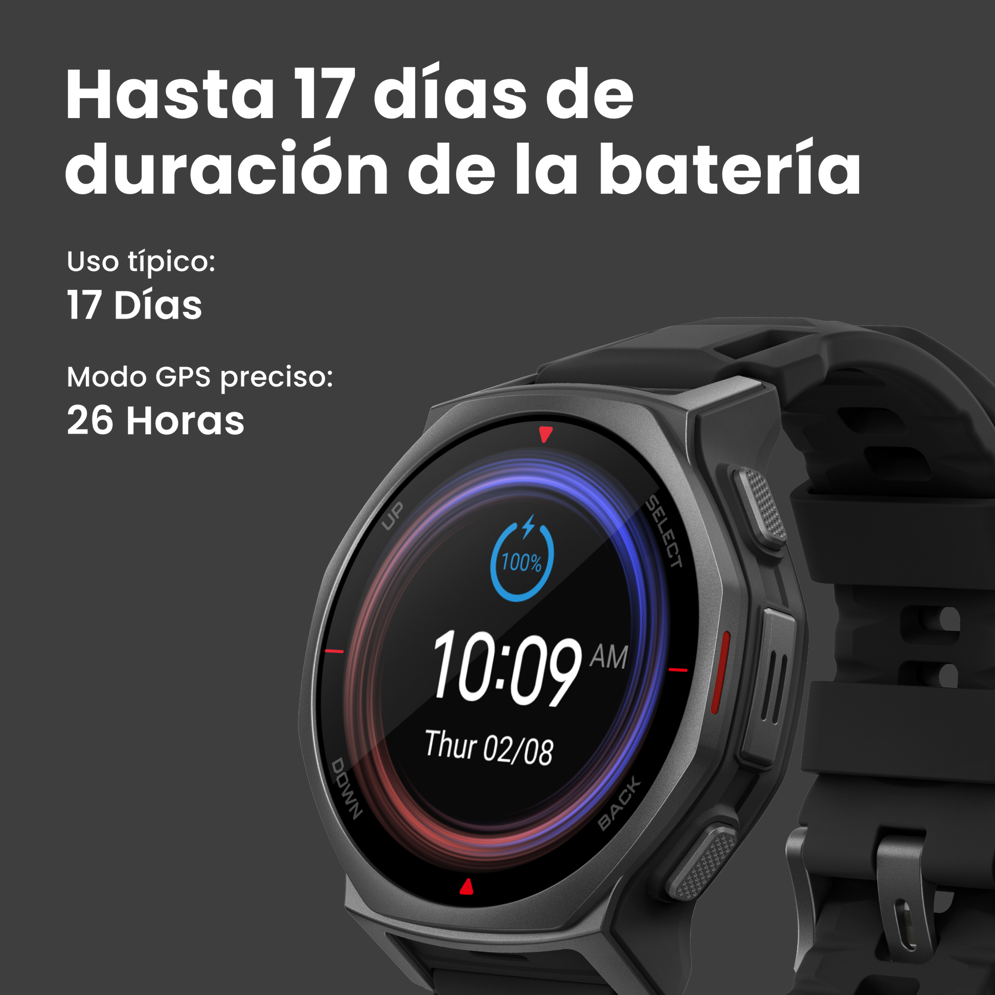 Diseñado para acompañarte en tus aventuras más largas, este reloj ofrece una duración de batería excepcional ⁸ para que puedas concentrarte en el viaje, no en el cargador. Ya sea que te enfrentes a excursiones de varios días, semanas de competición o misiones remotas, se mantiene cargado cuando más lo necesitas.