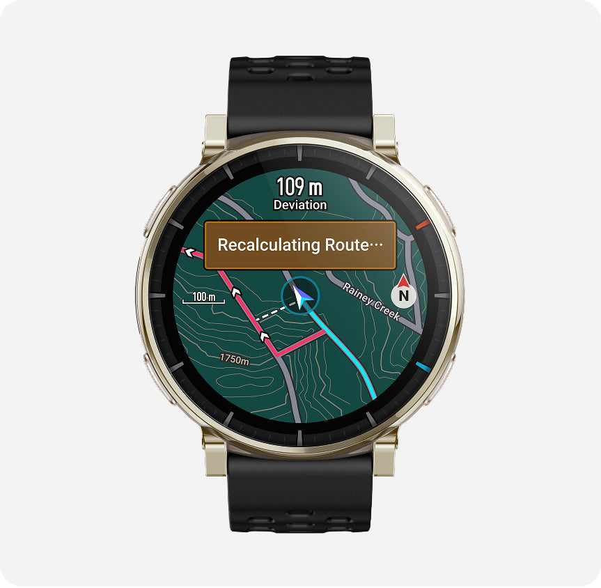 Establezca su distancia y dirección objetivo y su reloj creará automáticamente rutas de ida y vuelta optimizadas, calculará automáticamente la mejor ruta a cualquier ubicación y utilizará las rutas que haya planificado en la aplicación.