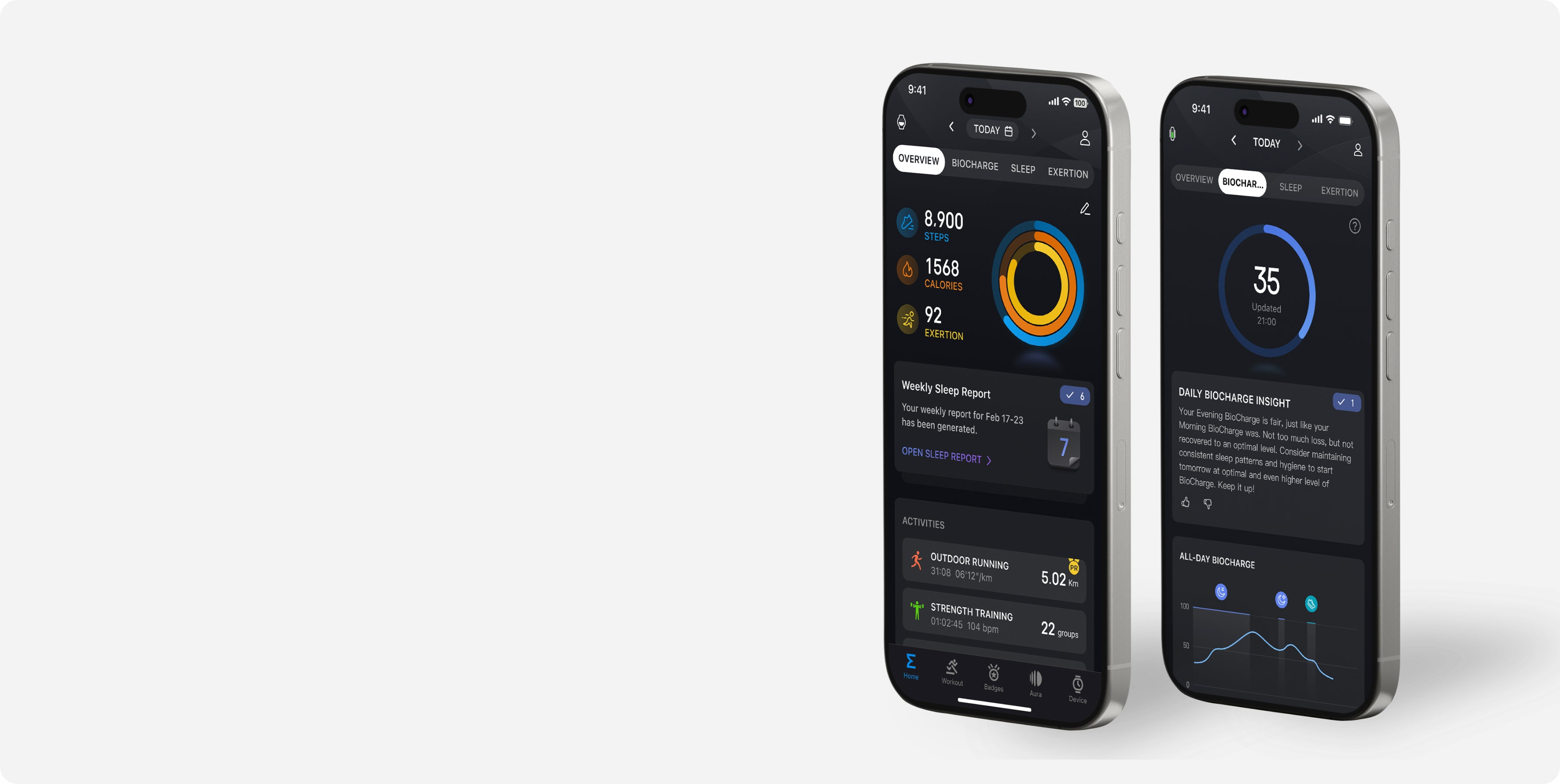 Desde el momento en que te despiertas después de una noche de descanso, tu puntuación BioCharge ™ se adaptará en función de tus entrenamientos diarios, actividades y niveles de estrés. -