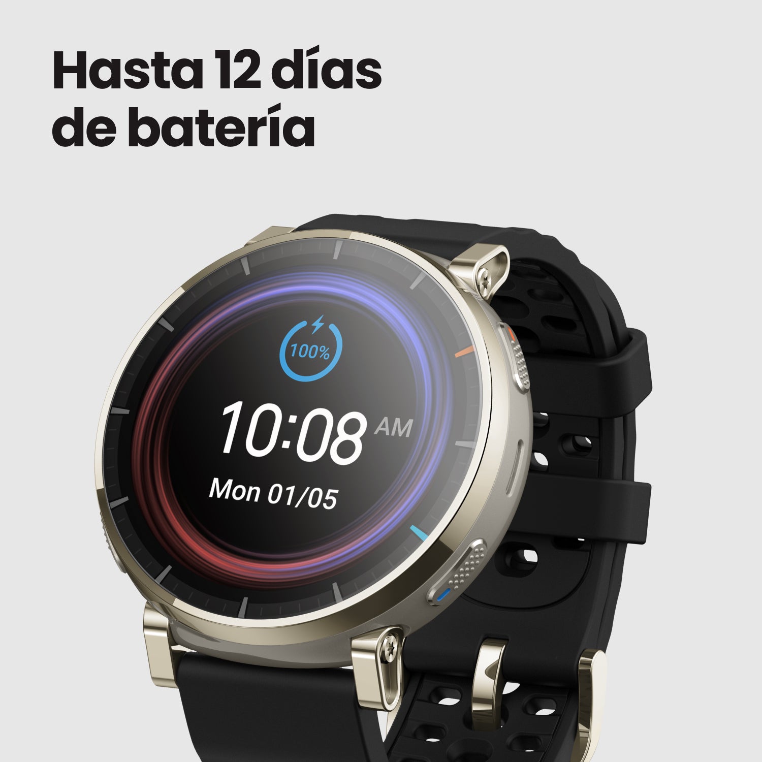 Escenario de uso intensivo: brillo de pantalla predeterminado, esfera de reloj dinámica, asistente de voz activado; uso 24/7/frecuencia cardíaca siempre activa (cada 1 minuto)/monitoreo del sueño asistido/monitoreo de la calidad de la respiración durante el sueño (8 horas /día)/monitoreo del estrés; Semanal: 30 minutos de llamadas Bluetooth, 60 minutos de reproducción de música, 210 minutos de actividad GPS; Diario: 100 activaciones de levantamiento de muñeca, 150 notificaciones de mensajes (pantalla encendida), 3 llamadas entrantes, 4 pagos NFC, 15 minutos de interacción con la pantalla encendida.